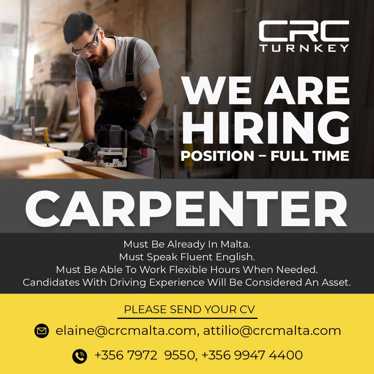 To apply, please submit your CV on Email: elaine@crcmalta.com, attilio@crcmalta.com